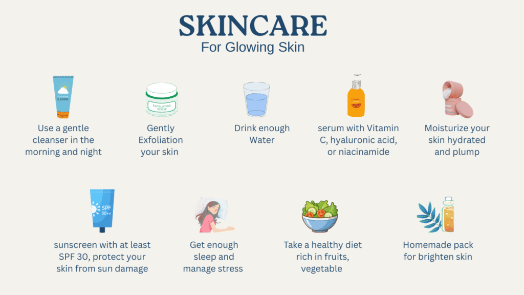 Eat healthy, hydrate well, follow a daily skincare routine, and protect your skin from the sun — and your natural glow will shine through.